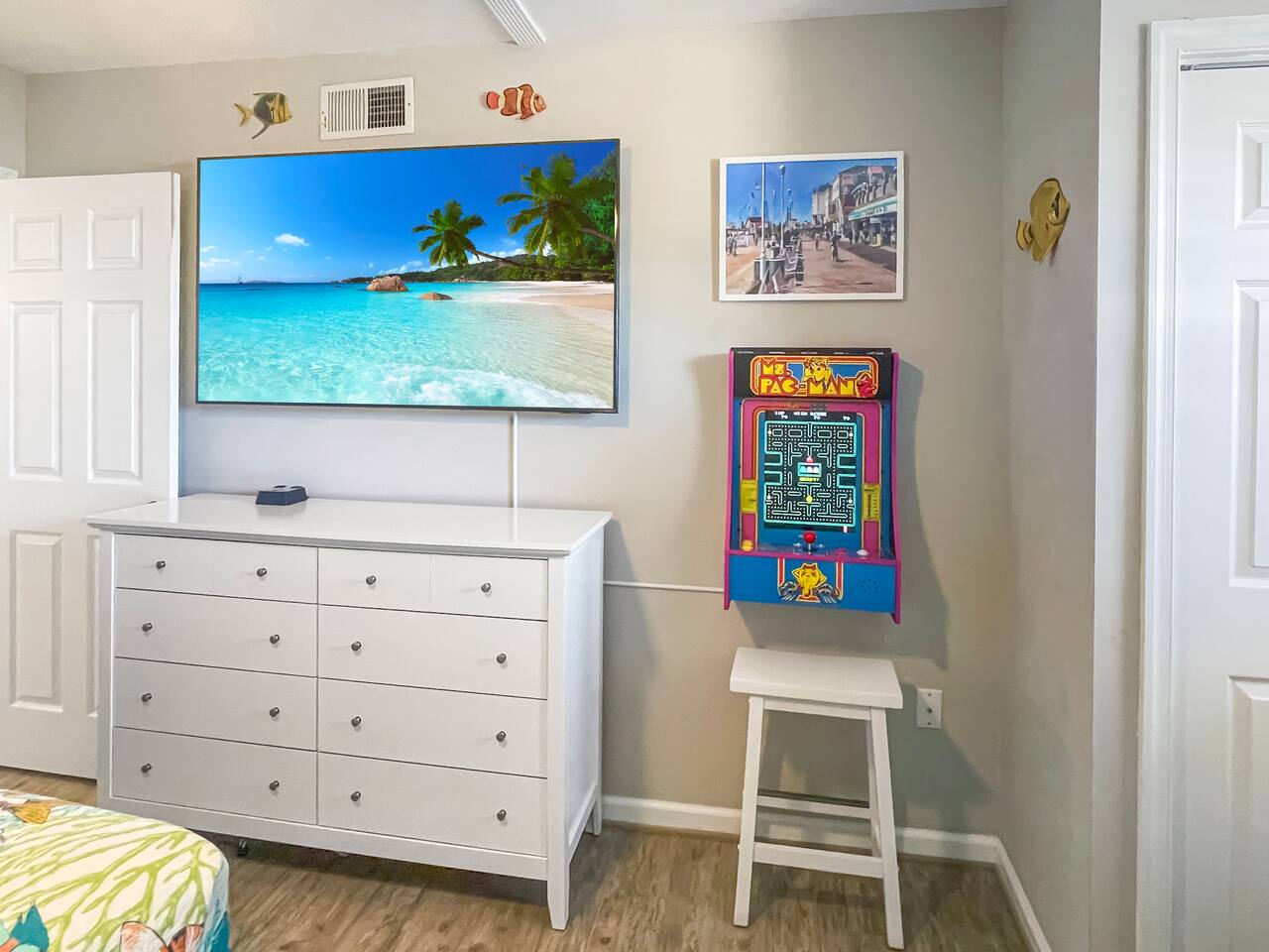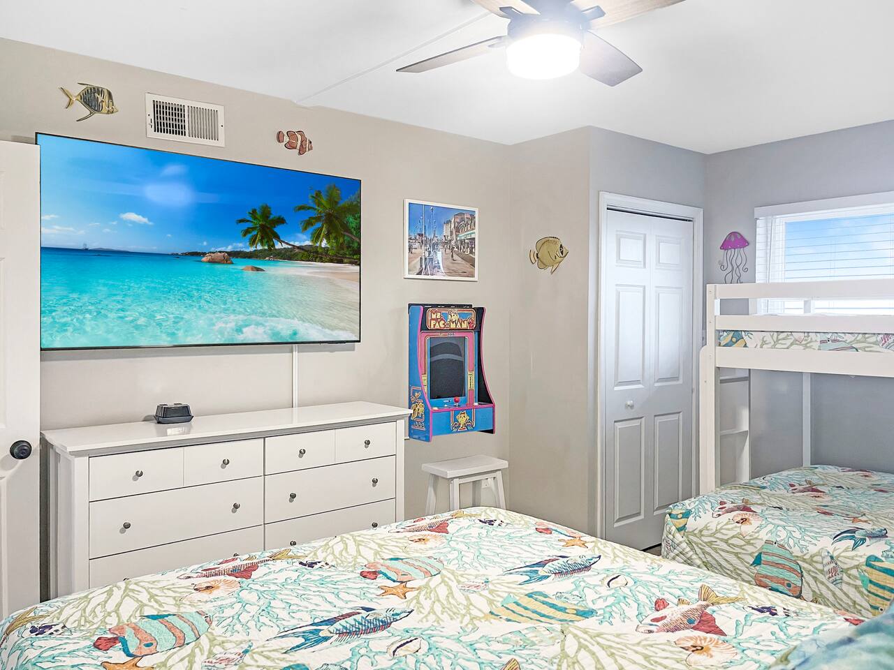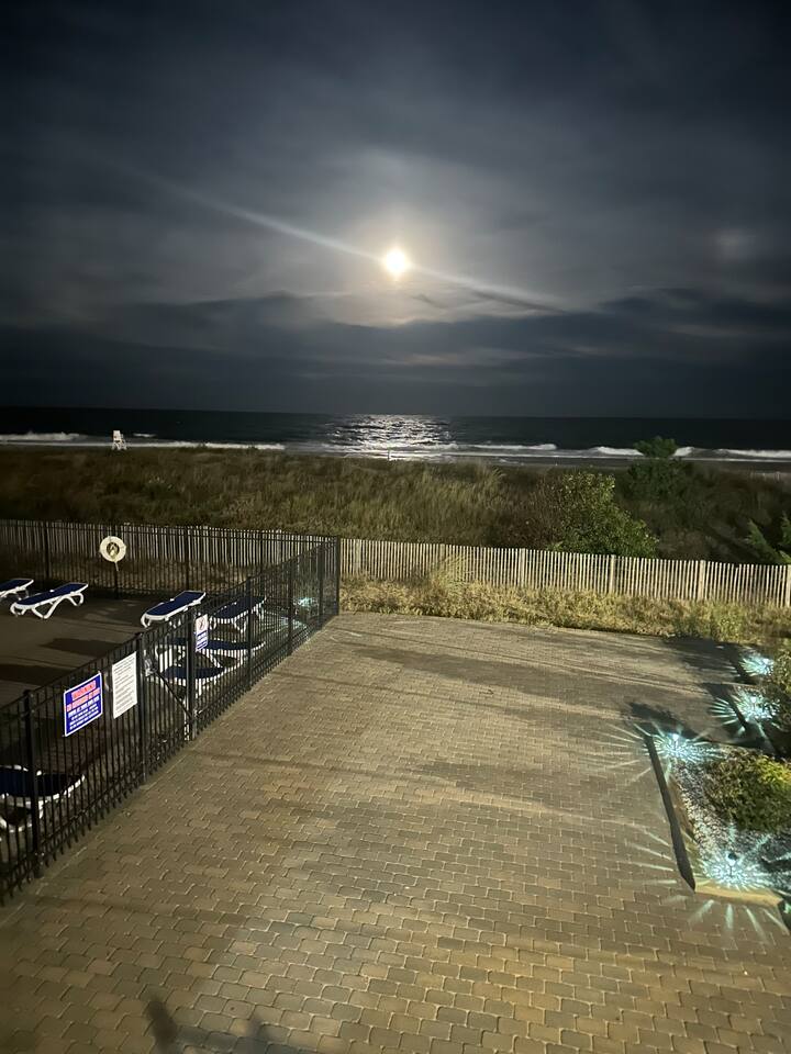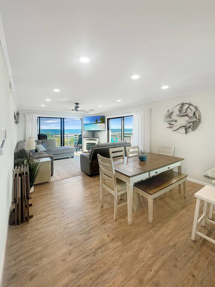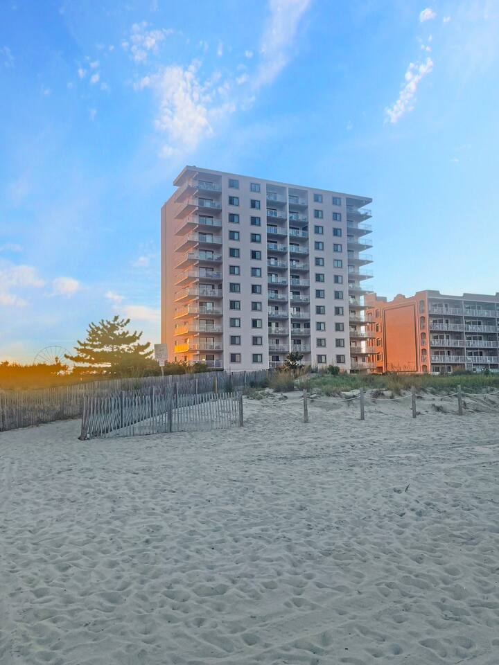 Wake up to the sound of crashing waves in this stunning oceanfront condo! The king bedroom offers an oceanfront view, letting you enjoy the sights and sounds of the Atlantic from your window. The second bedroom is a playful retreat featuring a queen bed, a queen/twin bunk, and plenty of entertainment including a Pac-Man Arcade, Arcade1Up Infinity Game Board, board games, and toys—fun for guests of all ages. The living room features a queen pull-out sleeper sofa and provides a wrap-around view of the ocean, perfect for relaxing, watching the waves, and spending time with family and friends. All linens are included, so you can arrive and start your vacation stress-free! Large TVs throughout offer streaming services and Xfinity cable channels for your entertainment. Enjoy seasonal pool access, or take a short stroll to the iconic Ocean City Boardwalk, restaurants, and shops. With one dedicated parking spot, everything you need is within walking distance—once you park, your Ocean City adventure begins! This condo combines comfort, convenience, and oceanfront fun in one perfect getaway.