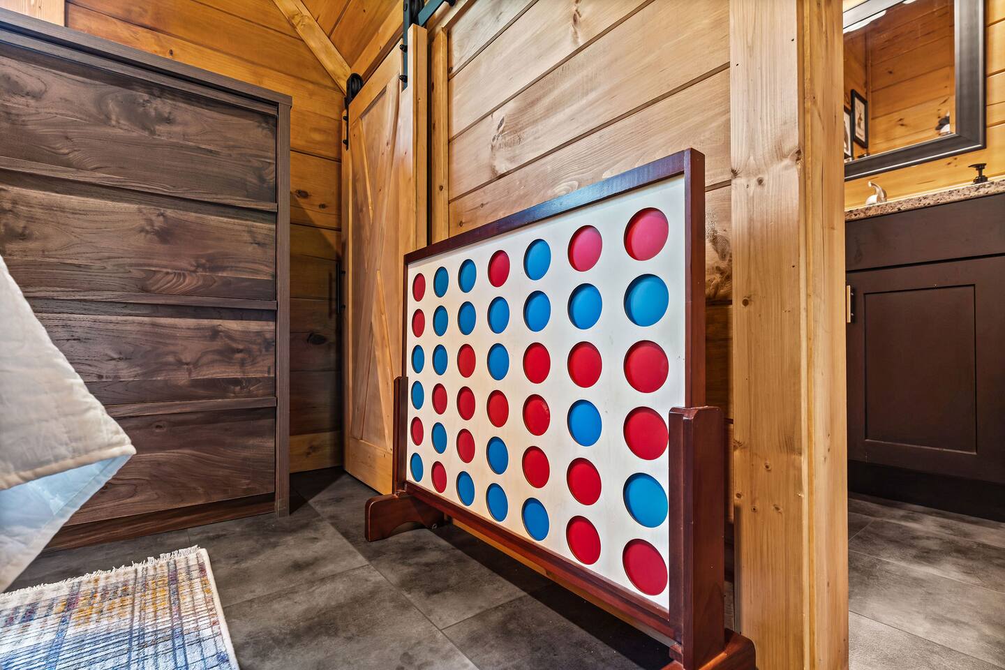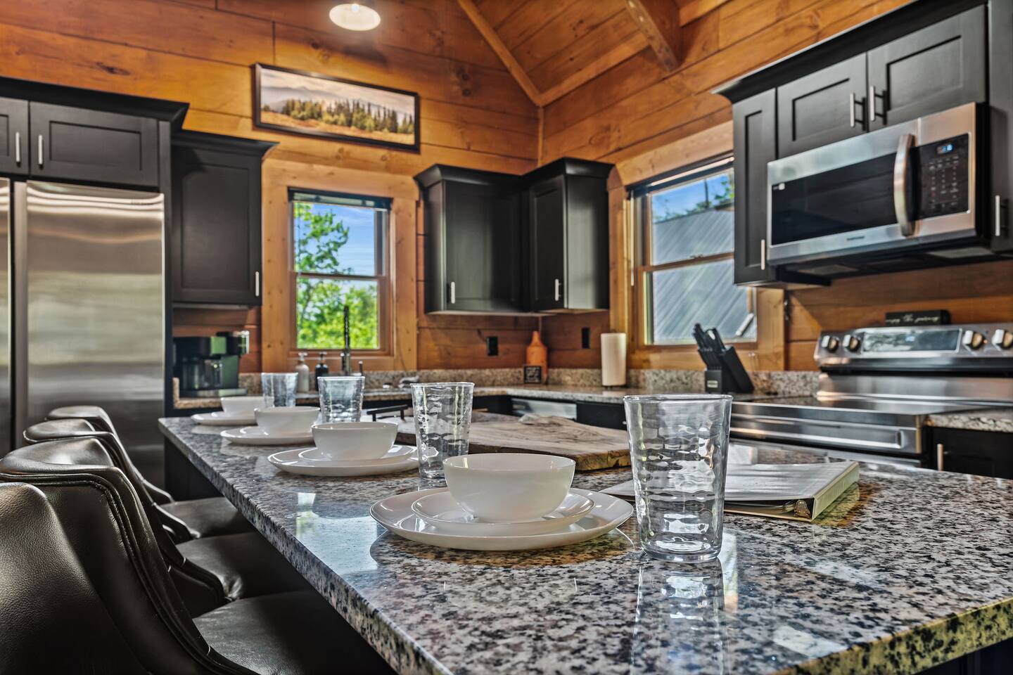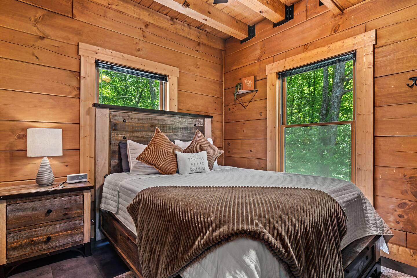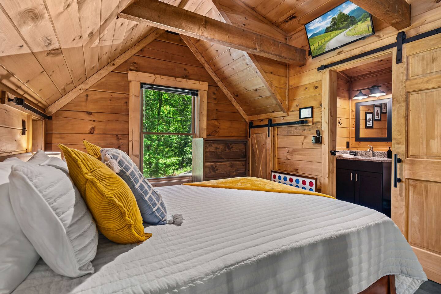 The Space Bedrooms: Bedroom 1: King Bed Bedroom 2: Queen Bed Loft: Queen Bed Sleeper Sofa in Living Room Bonus Space for Kids: Hidden Loft with an Arcade Classic Games Console Outdoor Living: Fire Pit (bring your own wood) Spacious Porch Deck with Rocking Chairs Hot Tub Indoor Comforts: 4 Smart TVs Electric Fireplace Board Games Ceiling Fans Central A/C & Electric Heat Fully Equipped Kitchen: Refrigerator, Stove, Oven & Dishwasher Dishware & Flatware Microwave & Toaster 2-in-1 Keurig & Drip Coffee Maker Water Filter General Amenities: Wi-Fi Washer & Dryer 2 Hair Dryers Towels & Linens Provided Parking: Driveway for 3 Vehicles FAQ: Features both a Flight of Stairs and a Handicap Ramp for Accessibility